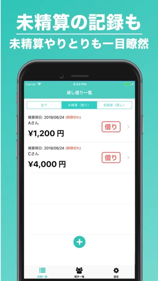 貸し借りの記録の一覧を表示します。ただ全ての一覧だけでなく、未精算のものだけを表示したりできます。