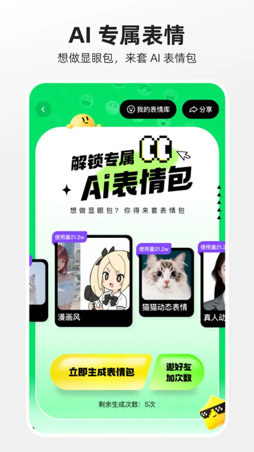 在这里,你可以把宠物、朋友、恋人、老板、爱豆都作为你的创作素材和对象,创造专属于你的表情包,动漫风、浮夸风、人脸动态化、宠物动态化,只要你的素材足够多,你就是表情包梗图制作人