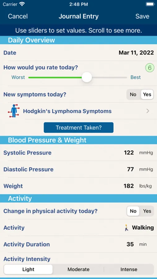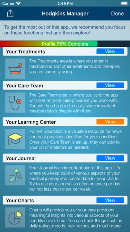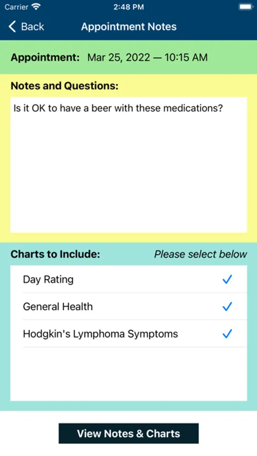 For many, the best part of using Hodgkin Lymphoma Manager, is seeing moods, pain, medications—even how often they journal—in colorful pie charts. When your health journey is presented this way, it is easier to spot trends, notice strengths, and identify areas of concern.