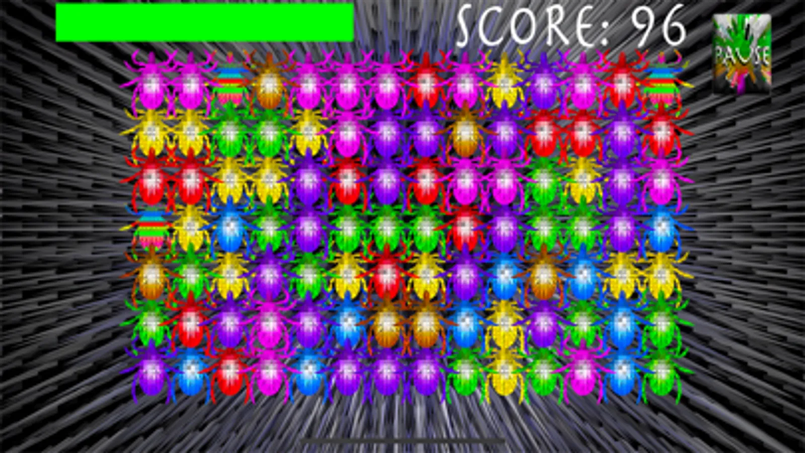 You have 100 seconds to play. Tap 3 or more like-colored spiders to score. Tap 2 to move the row. Tap 1, move the row but lose 5 seconds. Tap the striped spider and proceed with 30 seconds of psychedelia. Highest score saved automatically. Have fun...