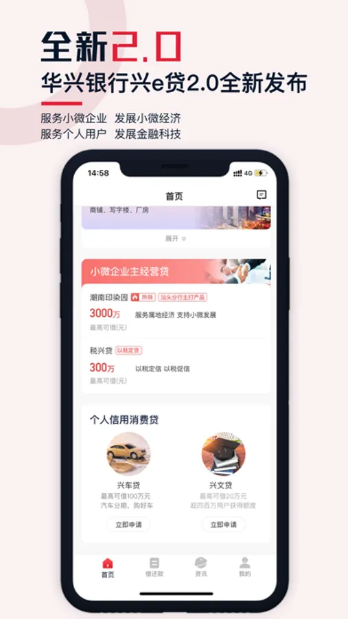 兴e贷是广东华兴银行开发的个人线上金融服务创新产品,包括个人生产经营贷款与个人消费贷款等子类。该产品通过大数据分析,结合互联网技术,实现用户从申请至提款全部线上完成,无需抵质押,资金分钟到账,以科技金融为用户提供高效便捷的融资服务。