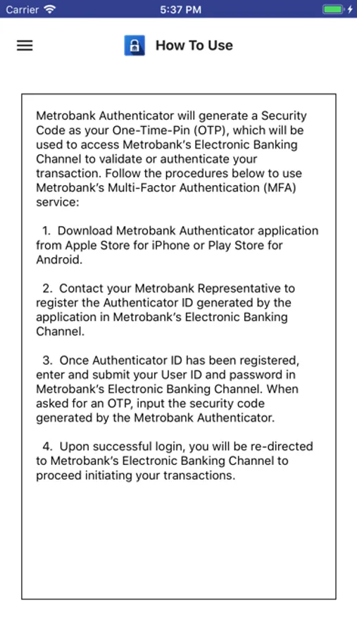 Metrobank Authenticator is a mobile application service to be used for MBTC’s e-channels for multi-factor authentication (OTP) authentication.
