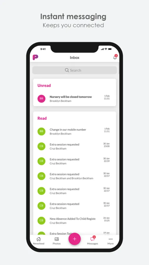 Parents can send notifications directly to the nursery requesting any booking pattern changes, extra sessions, changes to emergency contact details, new allergy requirements, etc. The Nursery can also send notifications to parents keeping them up to date with emergency closures, newsletters, etc.