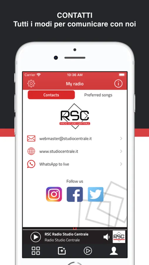 Puoi ascoltare i nostri programmi, interagire in diretta con SMS e Whatsapps, salvare in tempo reale le canzoni trasmesse tra i tuoi preferiti e scoprire gli altri canali musicali di Radio Studio Centrale: RSC Italia e RSC Relax.