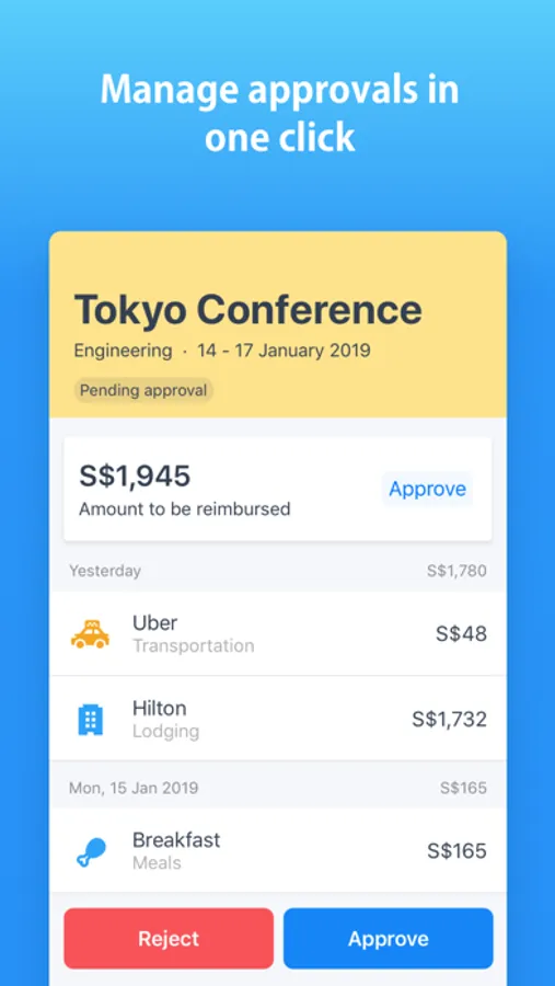 * Submit for approval in one click: Submit your expense report to your manager in just a single click.