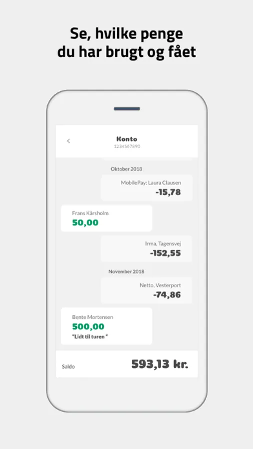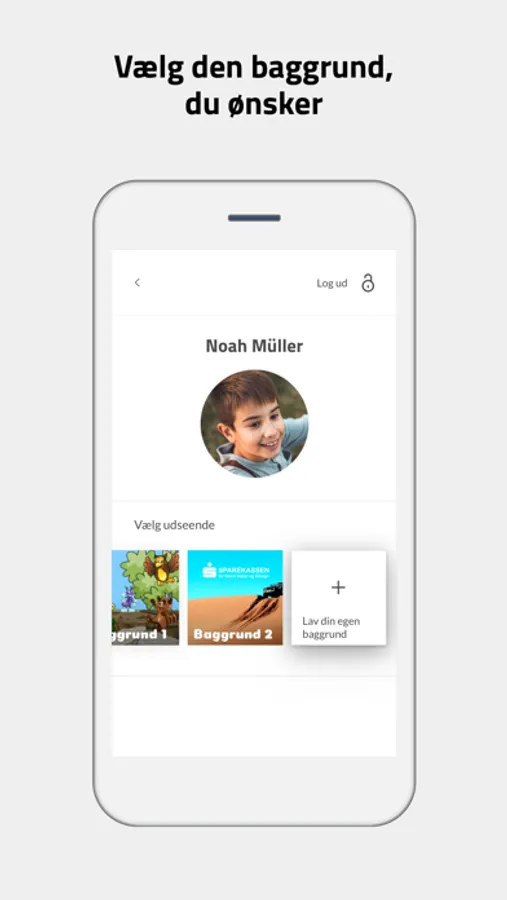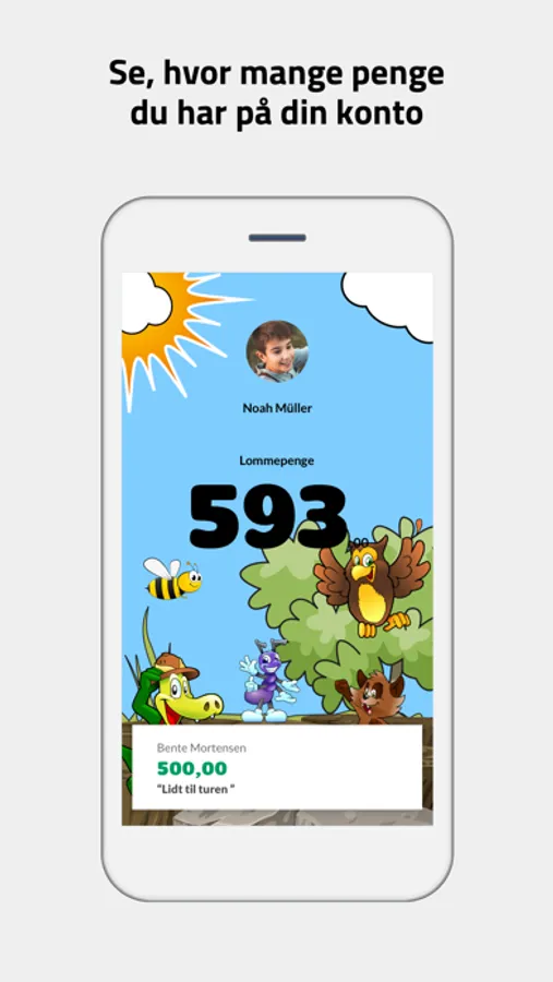 "Mine Penge" er en app til vores yngste kunder, som gerne vil have et overblik over hvor mange penge de har til rådighed. Der er mulighed for en personlig styling, med eget billede og baggrund.
