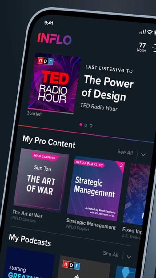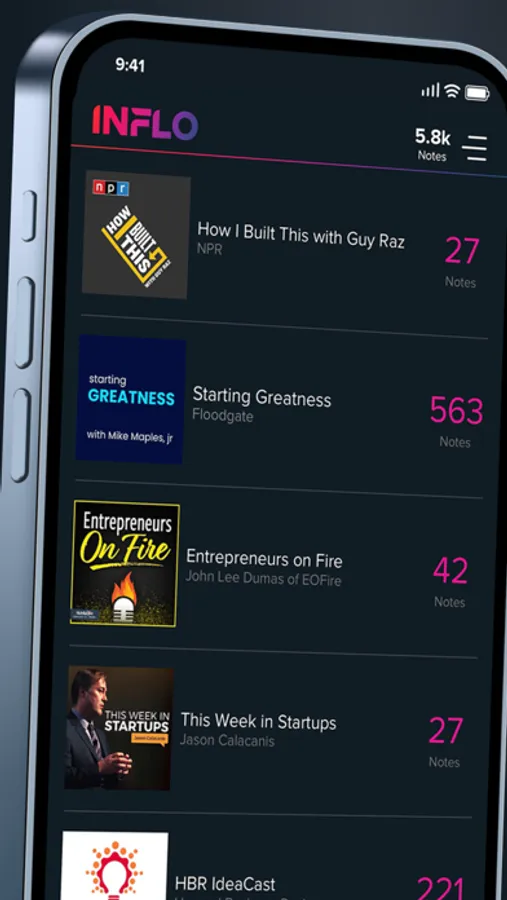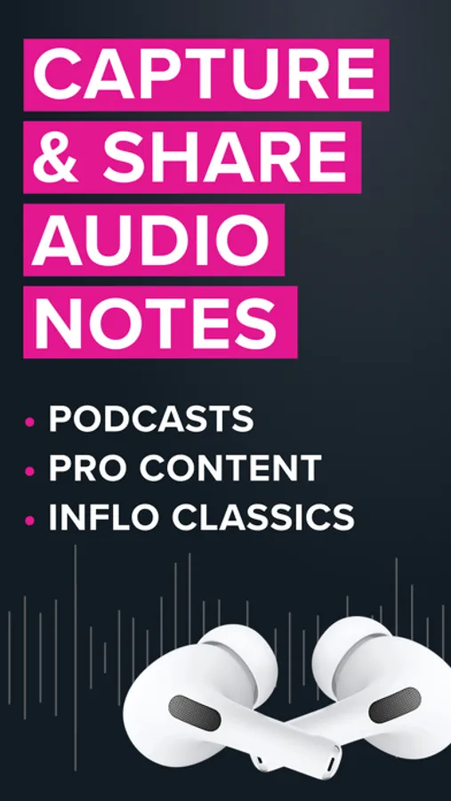 Take notes on all your favorite podcasts in the “My Podcasts” section of INFLO. Listen and take notes on a growing collection of professional articles and classic books in the “My Pro Content” section. Share the notes you capture.