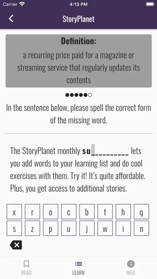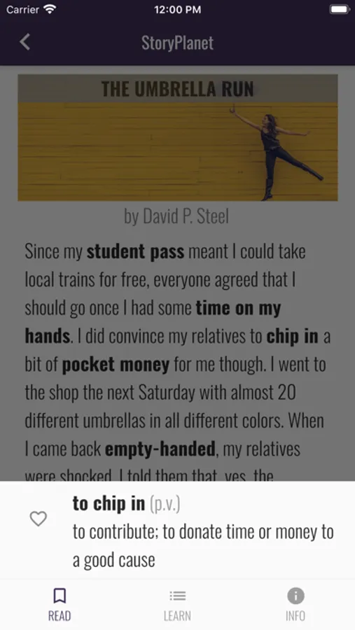 All difficult words & expressions (B1 and above) are boldface. Just click on them to get definitions! Your English will quickly improve. You’ll pick up new vocabulary, get exposed to grammar in a typical context and get a better feeling for sentence structure. Add words to your personal learning list and do exercises with them to help commit them to memory for good! Try it out with our 3 sample stories for free.
