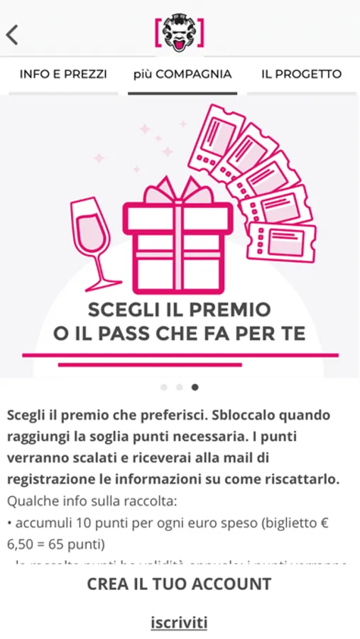 Con l'app de La Compagnia potrai avere sempre a portata di smartphone la nostra programmazione, acquistare i biglietti in prevendita online e partecipare alla raccolta punti Più Compagnia. Utilizza l'app come una moderna "carta fedeltà": scaricala, registrati e mostra in cassa il tuo codice APP quando acquisti un biglietto. In questo modo accumulerai punti utili a sbloccare i numerosi premi disponibili.