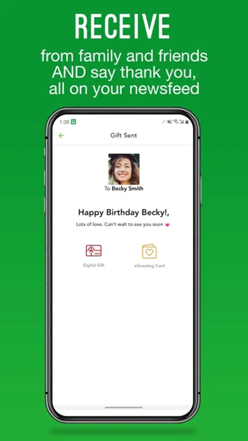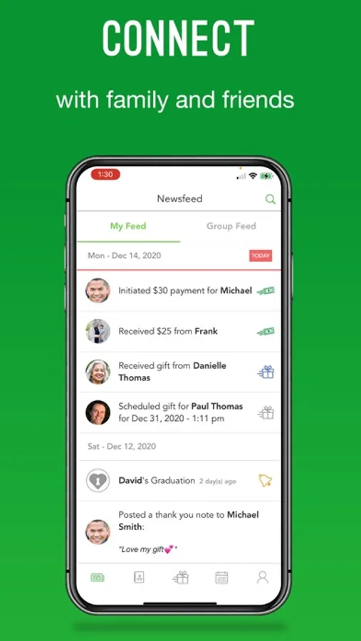 NEWSFEED: The newsfeed displays all your activity in one place. It will list your invites and connections, special occasions, money and gifting detail, gift cards, videos, and greeting cards. Press the icons to display gifting details.