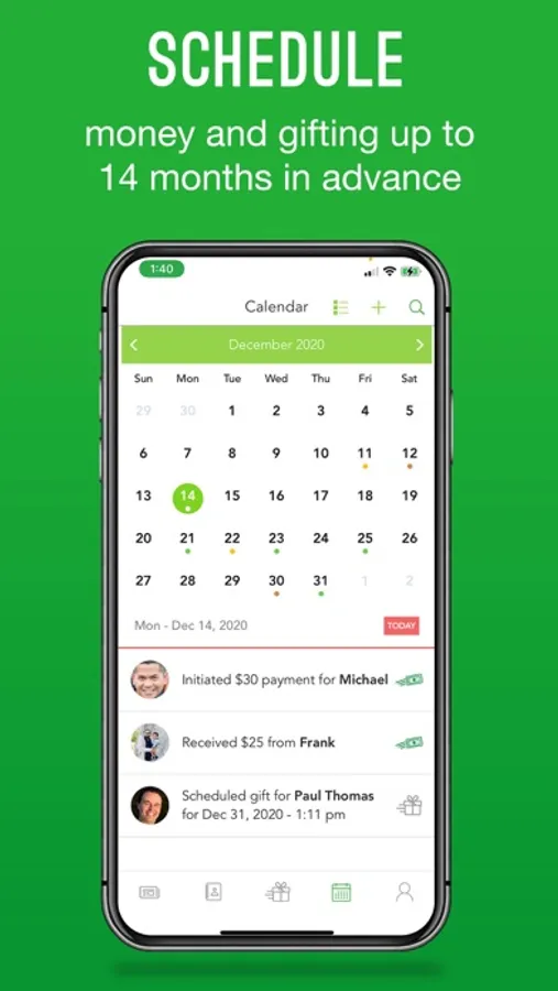 ADVANCED SCHEDULING: In one day, schedule up to 14 months of money and gifting. When that important occasion arrives, money, scheduled greeting cards, videos, and gifts will be delivered to the designated recipient on time, every time.