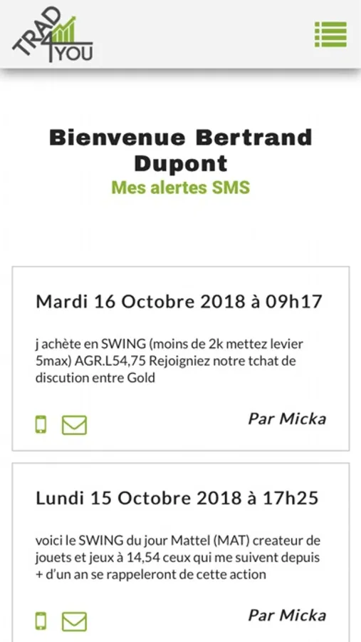 Leader sur le marché des signaux boursiers, vous pourrez suivre en temps réel les alertes et signaux de Micka et Greg via les notifications push de l’application TRAD4YOU.
