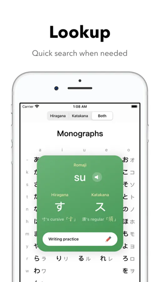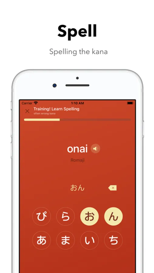 Reinforce your memory of unfamiliar kana through spelling.