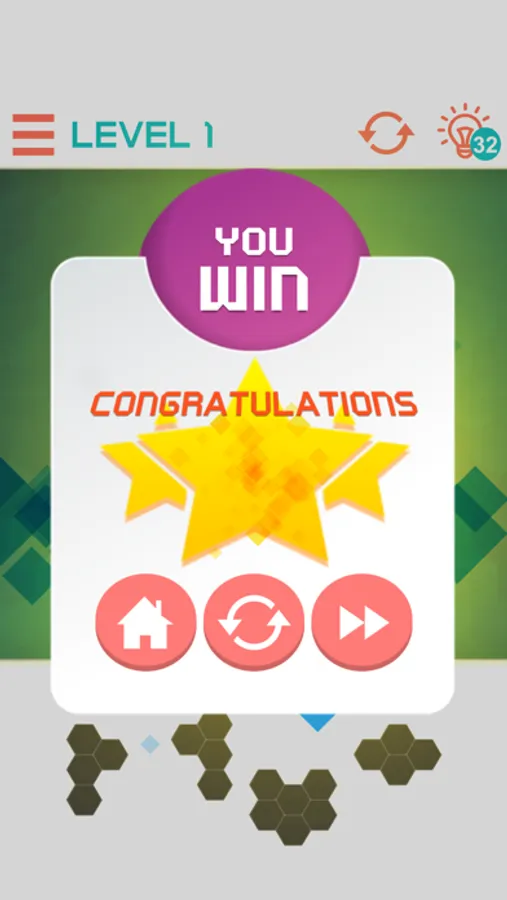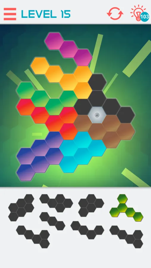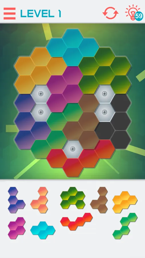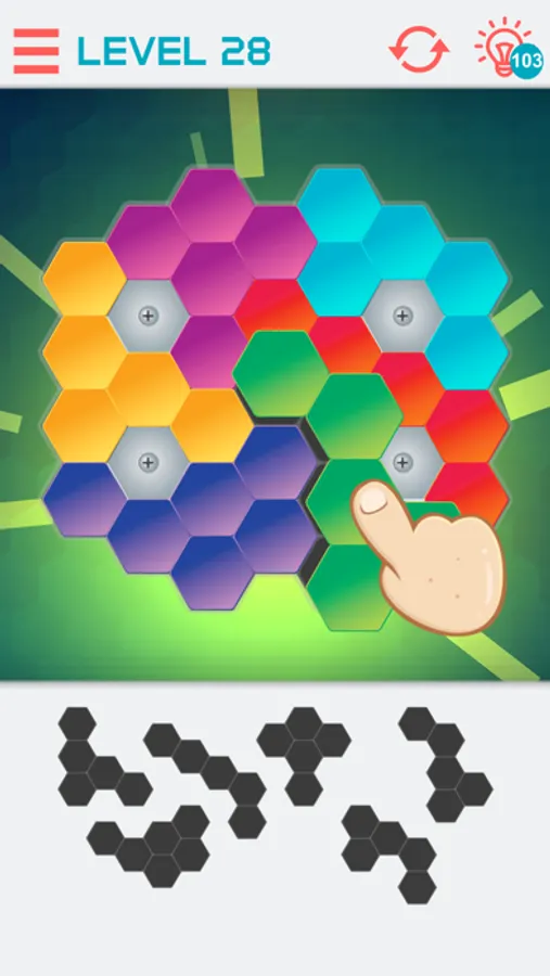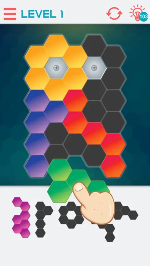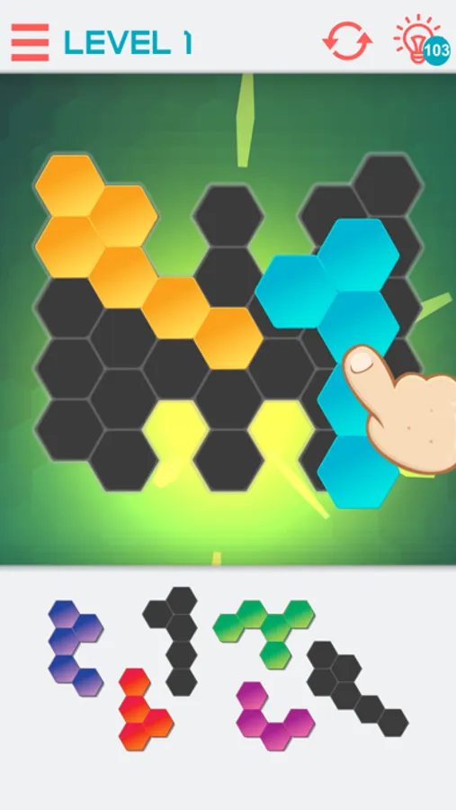 The rule of the game is very simple, anyone should be able to start playing immediately. On the middle of the screen, you are presented with a board consisting of hexagonal grids. On the bottom area of the screen, you are given various shapes formed of hexagon blocks. Fill the board with the shapes. You can drop a shape onto the board as long as the shapes match the grids. Just drag the shapes to the board to drop them and they will snap.