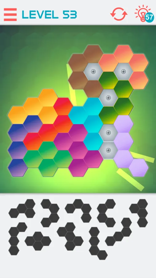 Drag and drop blocks of hexagons to complete puzzles. It's like surreal abstract jigsaw puzzles with hexagonal shaped blocks.