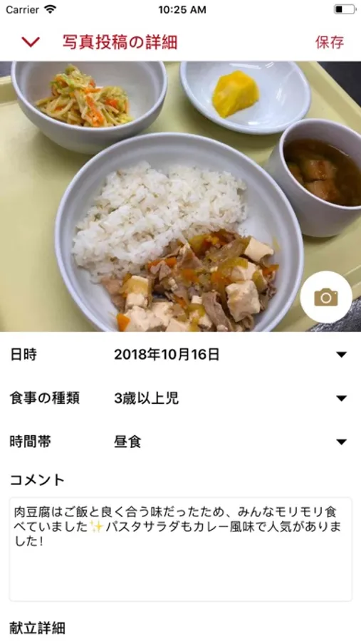 ・登録された写真とコメントは、献立情報とともに保護者繊維用のキッズミールアプリに届きます。