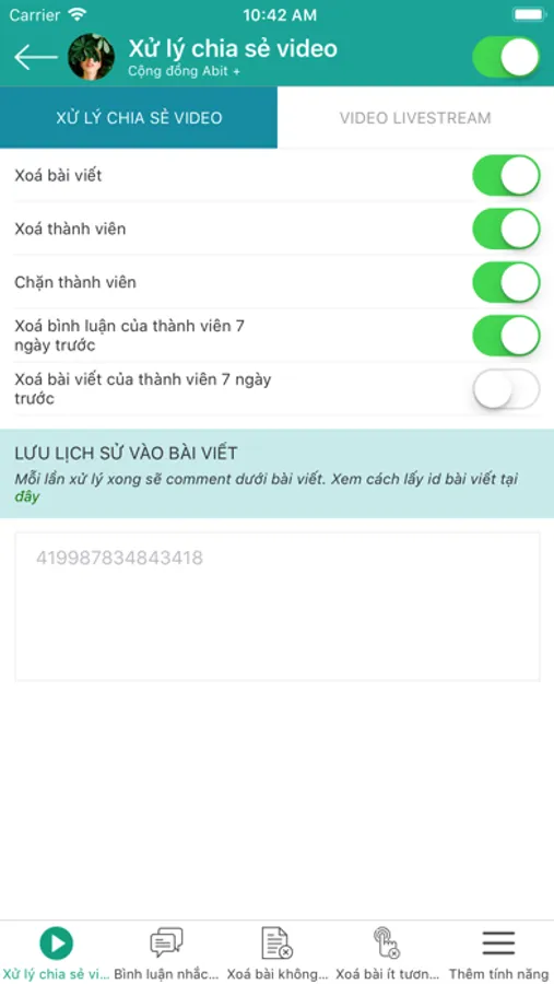 - Automatically delete the share livetream post that you allow to share to the group after a certain time set by you (for example: delete the livetream after 10 days post, ...)