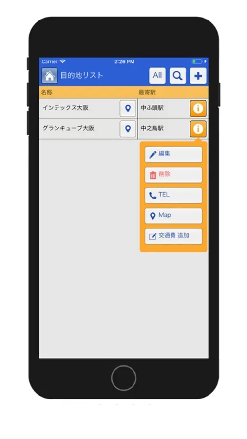 ・『交通費追加』や『目的地リスト』から記録した交通費を一覧で表示します。