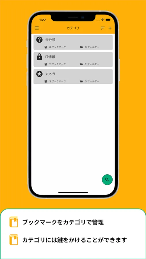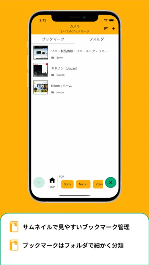カテゴリとフォルダで自分好みに分類したり、検索機能によってブックマークが多くなっても目的のサイトを見つけやすくなります。