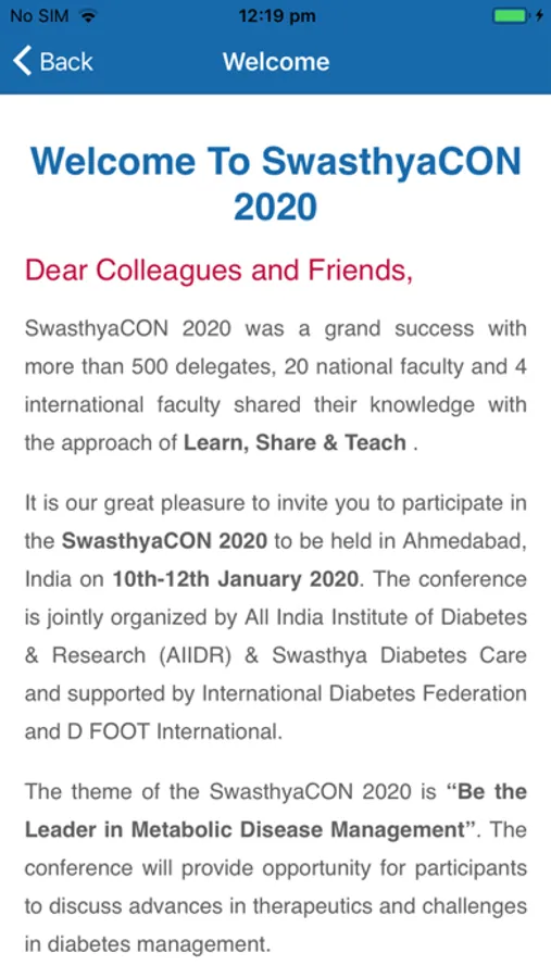 This application is intended for use by participants i.e. delegates, organizers & sponsors to cover the entire gamut of activities beginning from registration, scientific programme updates, details of conference etc.. This is an interactive app that will help delegates connect with each other as well as the faculty before, during and even after the conference.