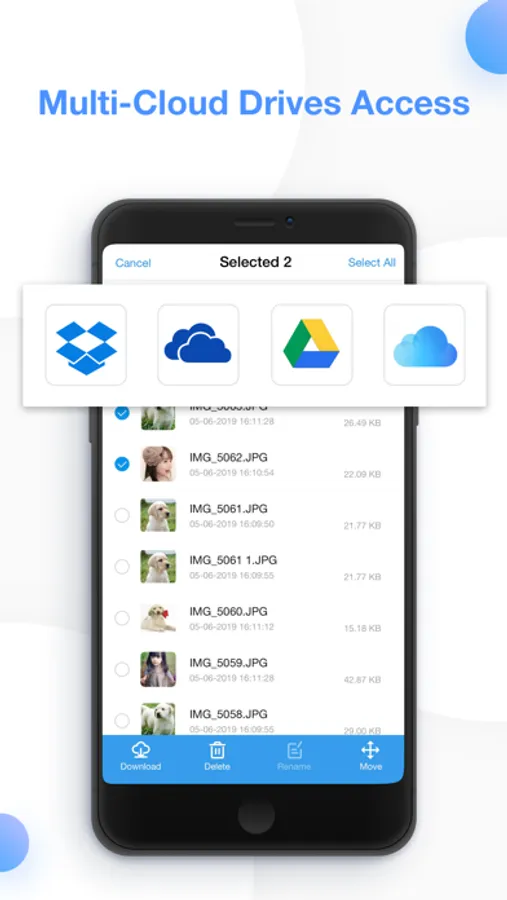 - Send, move, delete, rename, upload or download photos, videos, documents, and more from Google Drive, Dropbox, iCloud Drive, etc.