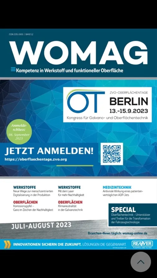 WOMag - Kompetenz in Werkstoff und Oberfläche - ist das Fachmagazin für technisch-wissenschaftliche Informationen über Werkstoffbe- und -verarbeitung bis zur abschließenden Oberflächenbehandlung.