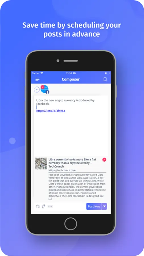 - Automatic shortening and hashtag suggestions make it more compelling.