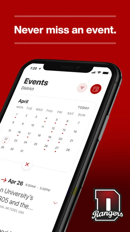The event section shows a list of events throughout the district. Users can add an event to your calendar to share the event with friends and family with one tap.