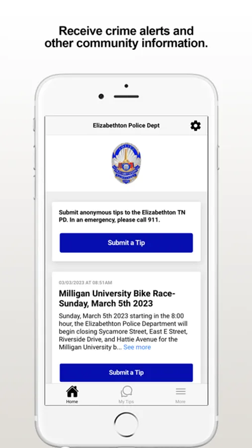 The Elizabethton PD app provides citizens the ability to submit anonymous tips to the Elizabethton, TN Police Department. The app also displays agency crime alerts, crime map, and other organization web and social media content.