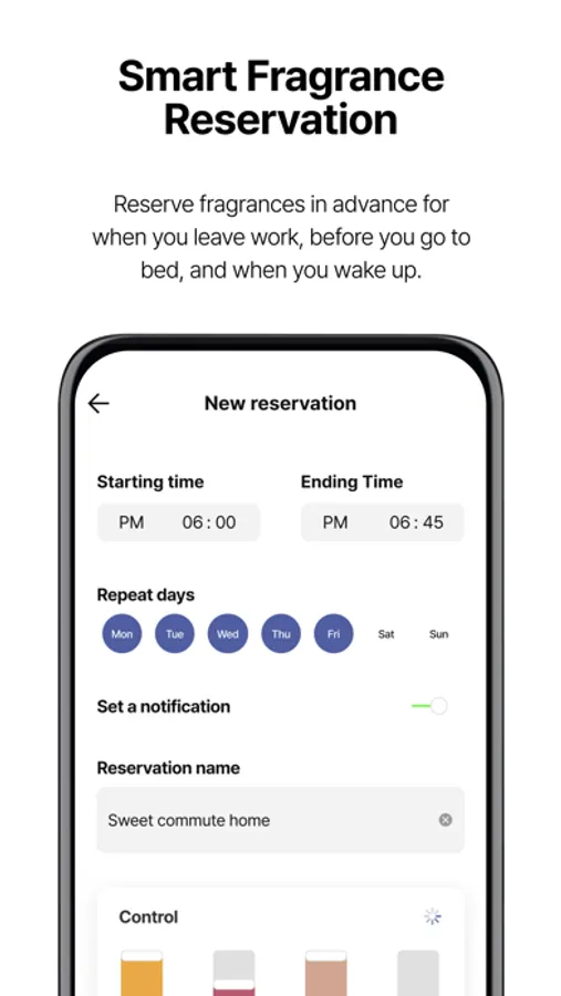 You can set the start and end times of the diffusion, as well as repeat days, for a convenient scent experience.