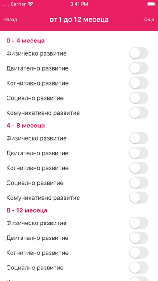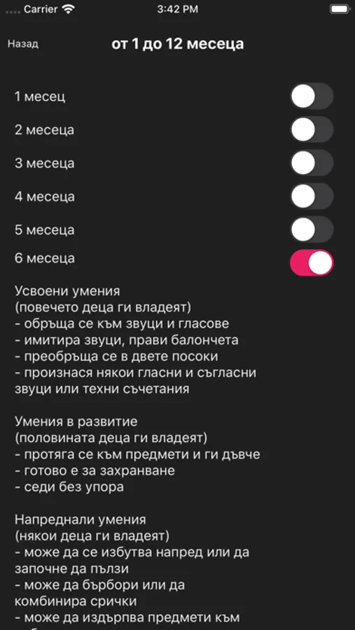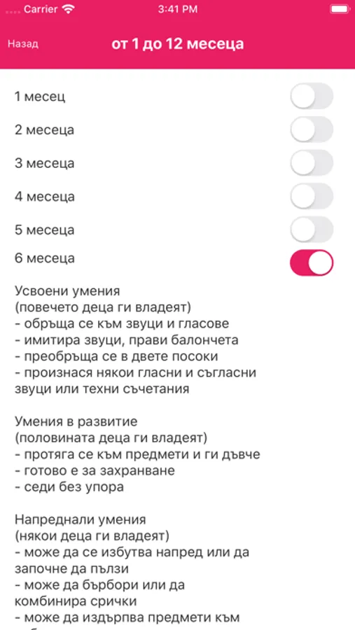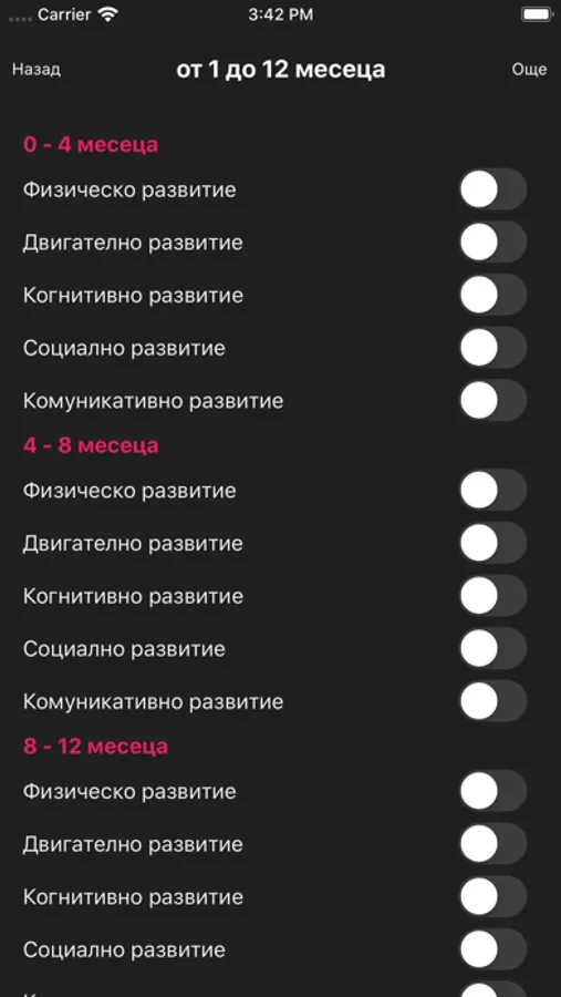 Програмата проследява възрастта на детето и текущото му развитие. Тя дава информация за развитието на детето от раждането до 12 годишна възраст. Чрез нея ще можете да проследите: