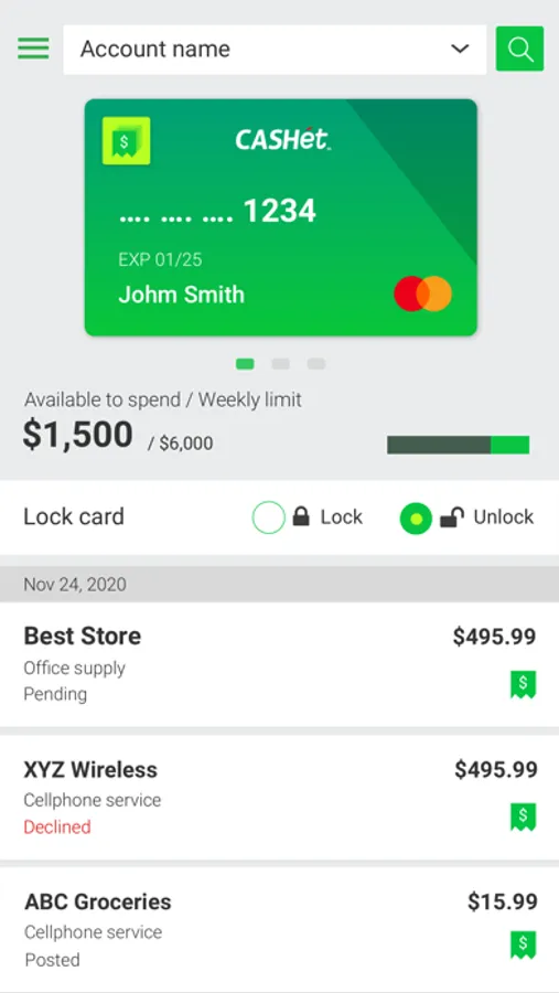 With the new CASHet App, not only will you be able to see all the cards on your account, and their available balances, but you can change the status of those cards at any time. This allows you to prevent fraud by blocking cards that are not in use - right from your phone. Having access to your cards in the mobile app allows you to see pending, posted, and declined transactions in real time. And if the transaction was declined you can see the details as to why it was declined. Also, the CASHet mobile app helps you stay organized by allowing you to attach a picture of a receipt directly to a transaction.