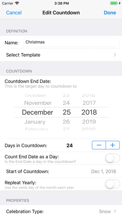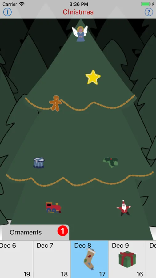 Countdown to Christmas or any other date you want with this app. By default the app is configured for your Advent Calendar needs, but the end date, number of days and themes can be changed to match your countdown needs. For up to 31 days before the target date, one ornament will be unlocked a day allowing it to be placed on the tree/display. You can admire or rearrange the ornaments at anytime. You can even shake the device to trigger a celebration that can change the countdown scene into a snow globe.