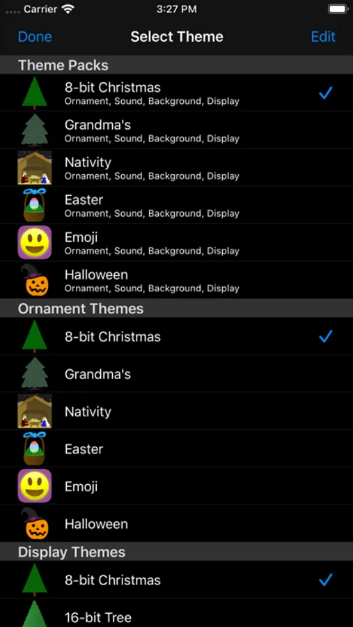 This application can use custom themes created with “CalAdvent Plus” (which is only available in the U.S.) and comes with the built-in Theme Packs: Grandma, Nativity Scene, 8-bit Christmas, Easter, Emoji, Halloween; and the Display Theme: 16-bit Tree.