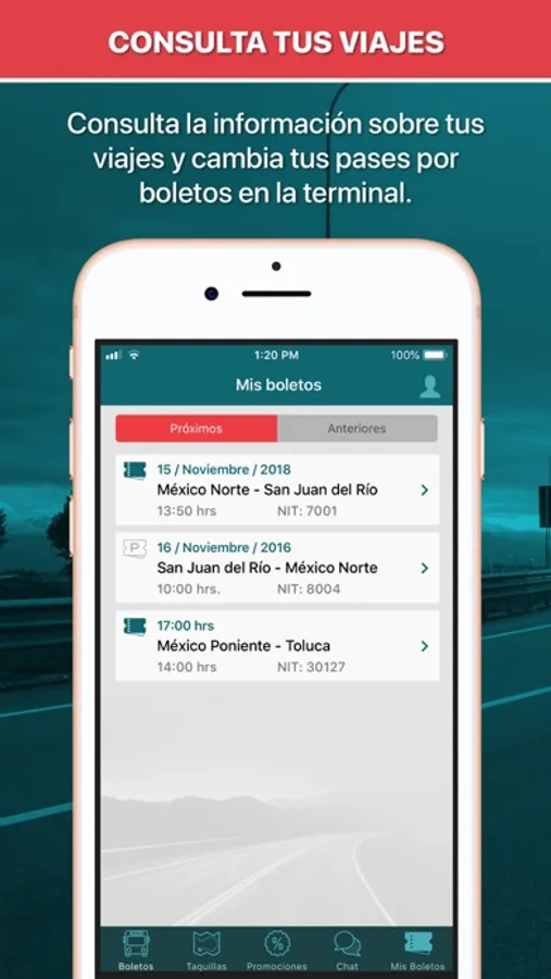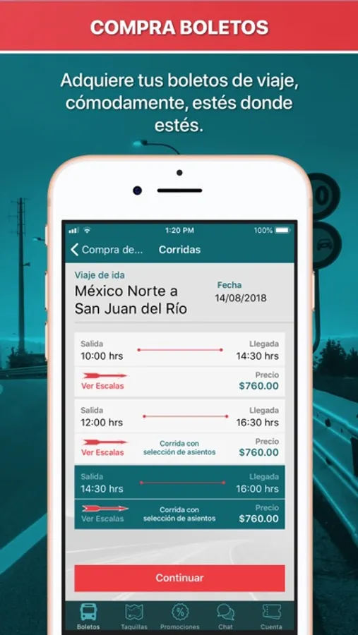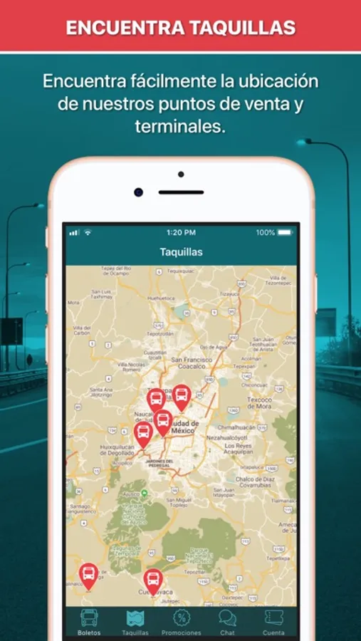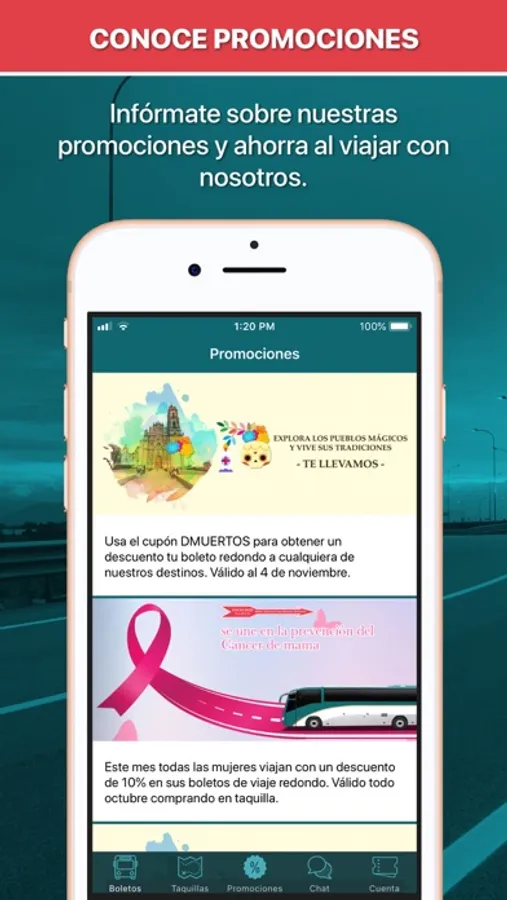 Descarga la App y entérate de las promociones que tenemos para ti, conoce nuestros puntos de venta, consulta horarios de salidas y accede a tu historial de viajes en cualquier momento.