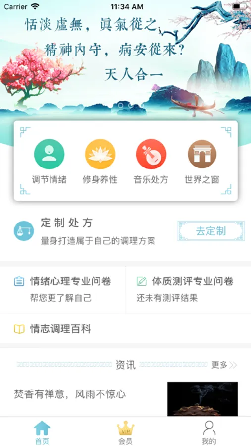 情志调理APP融合中医理论和西方艺术心理学,通过艺术、心理学、中医、脑科学、多媒体等技术手段,建立了调节情绪,修身养性和音乐处方三大模块,对用户的情志心理状态进行调理,达到增进健康、缓解疾病的目的。