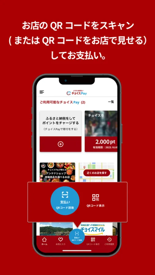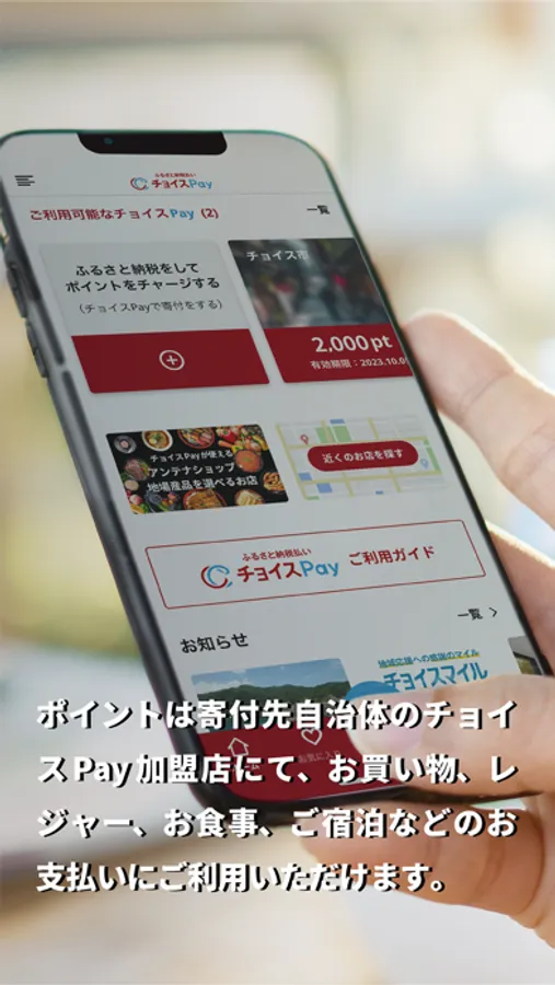 チョイスPayは、お礼の品 / 自治体掲載数『日本一』のふるさと納税サイト「ふるさとチョイス」が運営する、ふるさと納税のお礼の品としてもらったポイントで旅行やお買い物を楽しめるアプリです。
