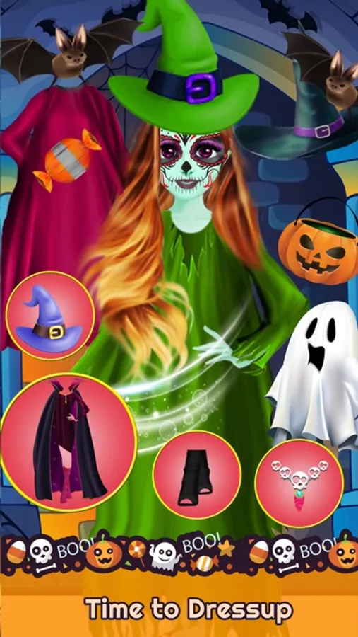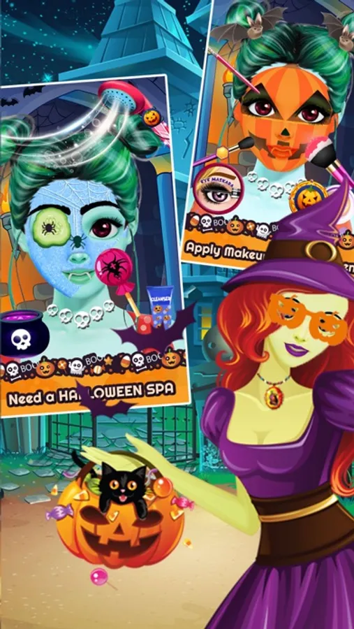 Can you help these cute girls to look spooky and beautiful for the Halloween? Girls also need to be dressed in a scary look. Make them fully ready for Halloween party. Halloween makeup salon includes different sorts of strange clothes, spooky make-up styles, multiple Halloween masks, Witch hairstyles, glasses, shoes and all that which you need to enjoy a Halloween girls party.