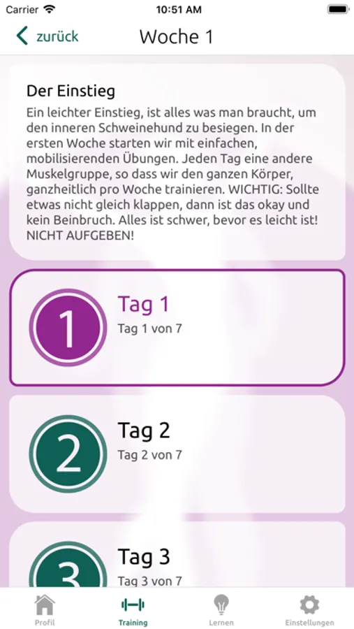 Mit dieser App soll ein leichter und einfacher Einstieg in die Welt der Bewegung gefunden werden. Mit viel Witz und Leichtigkeit, ohne Wettkampfgedanke und ohne Druck. Einfach wieder ein wenig Spaß am Bewegen finden und lernen, was es heißt, dem Körper was Gutes zu tun. Hier findet jeder sein Tempo, seine Schwierigkeit und das so wie man selbst möchte. Besser geht nicht!