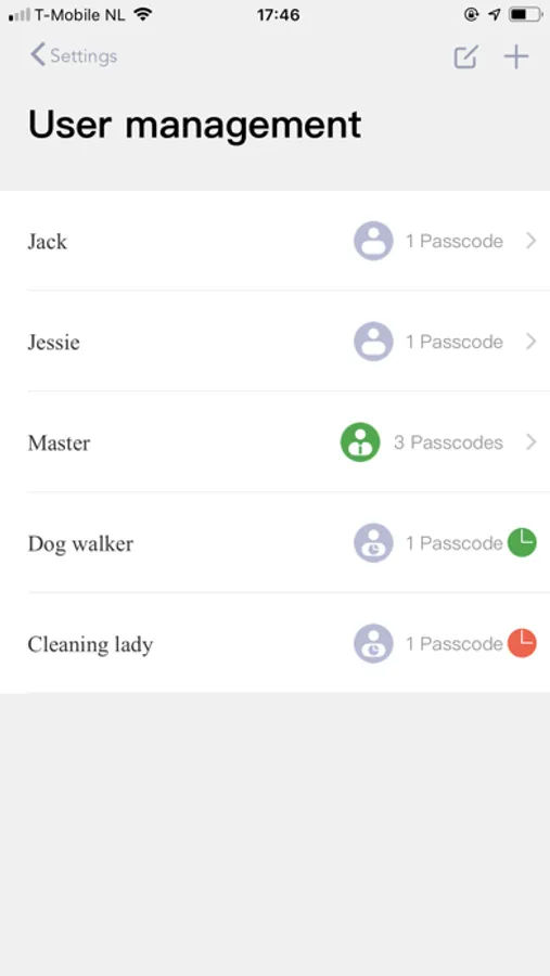 - Create and manage the access for your smart lock, for example One-Time-Code Users, Time-Limit Users, Agenda Users, Regular Users with permenant access and Secondary Users;