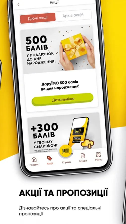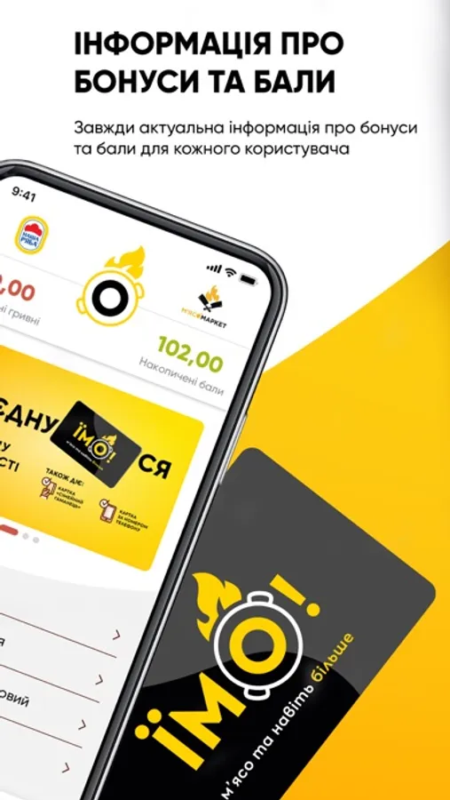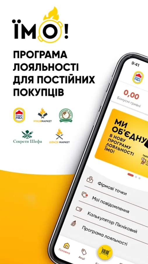 Нова програма лояльності «ЇМО!» діє у фірмових точках «Наша Ряба», «М’ясомаркет», «Döner Маркет», «Українське Курча» та гастростудії «Секрети Шефа». За кожну витрачену гривню учасники отримують на картку 1 бал. Накопичені бали кожного місяця перераховуються у бонусні гривні у співвідношенні 1 бал=0,01 бонусна гривня, які можна використати для наступних покупок