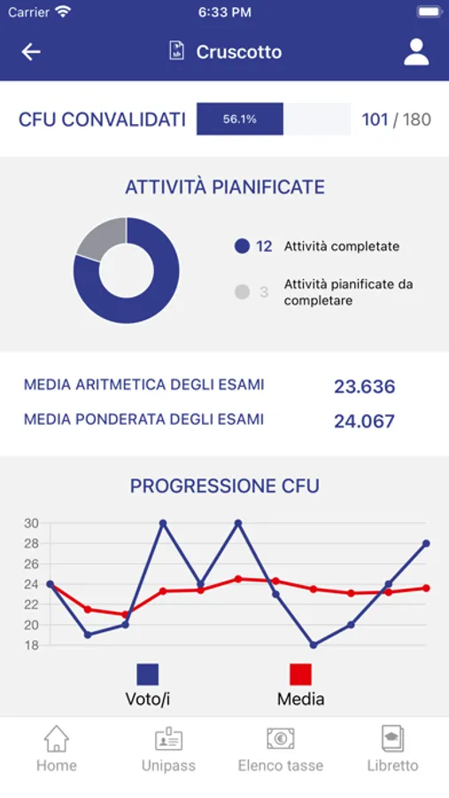 • guardare l’andamento della propria carriera accademica: esami sostenuti, piano di studi, media dei voti e dei cfu