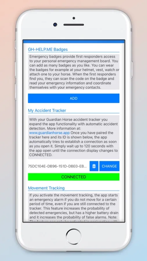 If you are on a ride, Guardian Horse is by your side. Imagine you have a riding accident and you are no longer able to get help by yourself, or you are in shock and cannot describe exactly where your helpers will find you. We developed the Guardian Horse System for such scenarios. The system consists of this rider app, your personal HelpMe board (at gh-help.me), as well as an optional accident tracker for automated accident detection and optional HelpMe badges that give first aiders access to your emergency data. After you have started a ride in the app, your smartphone becomes a GPS tracker and regularly sends your location to your Guardian Horse HelpMe board. Your emergency contacts can then access your location and other emergency data via the HelpMe board and your ID / PIN combination and, in an emergency, coordinate your rescue with all data at a glance. The basic functionality of the app can be used free of charge without any additional accessories. You can also buy one of our Guardian Horse HelpMe badges, which you attach to your helmet during the ride, for example, and which allows first aiders to also access your HelpMe board via QR code. You can also activate automatic accident detection with our Guardian Horse accident tracker. The tracker attached to the saddle or bridle is in contact with our app via Bluetooth during a ride. If there is a fall in the field, an alarm is sent to the rider's smartphone. If this is not deactivated, the Guardian Horse app automatically sends an emergency SMS to previously stored emergency contacts. Even serious riding accidents no longer go undetected and action can be taken quickly. You can purchase the GPS accident tracker and the Guardian Horse HelpMe badges at www.guardianhorse.app. There you will also find more information about the Guardian Horse safety system - your new riding companion and GPS tracker for riders. You can also link the app with the badges that are attached to helmets and vests from USG Equestrian Sports. You can find more information about this cooperation between Guardian Horse and USG Equestrian Sports at www.guardianhorse.app/usg.