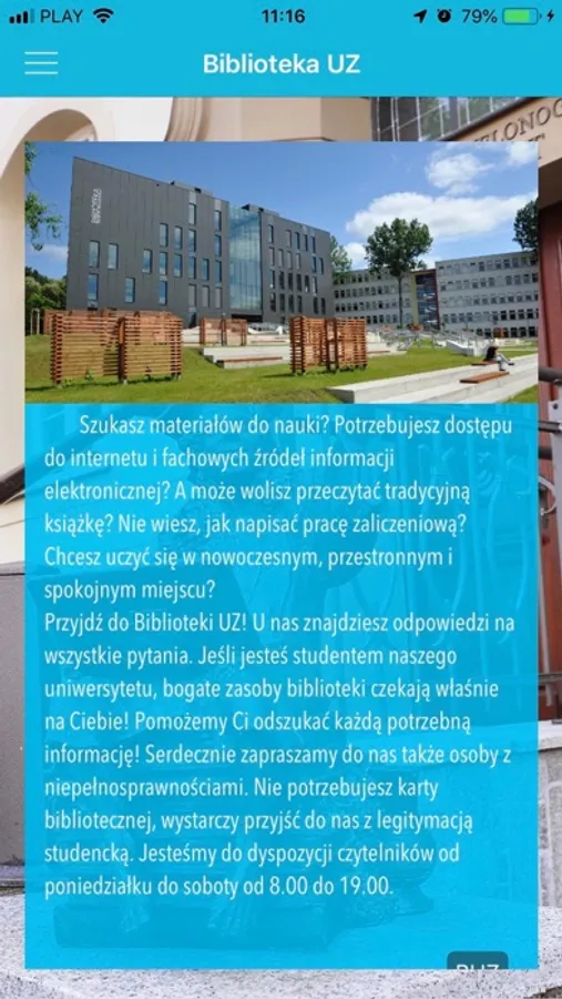 Aplikacja umożliwia zapoznanie się z niezbędnymi informacjami studentom rozpoczynającym naukę na Uniwersytecie Zielonogórskim. Ułatwia zorientowanie się w strukturach uczelni, w możliwości uczestniczenia w zajęciach dodatkowych zarówno naukowych, jak i sportowych, wyjazdach na inne uczelnie w kraju i zagranicą, a także zapoznania się z organizacjami studenckimi działającymi na Uniwersytecie Zielonogórskim. Dzięki niej można łatwo dotrzeć do poszukiwanych miejsc na uniwersyteckich kampusach oraz sprawdzić plan zajęć. Aplikacja umożliwia śledzenie na bieżąco ważnych komunikatów.