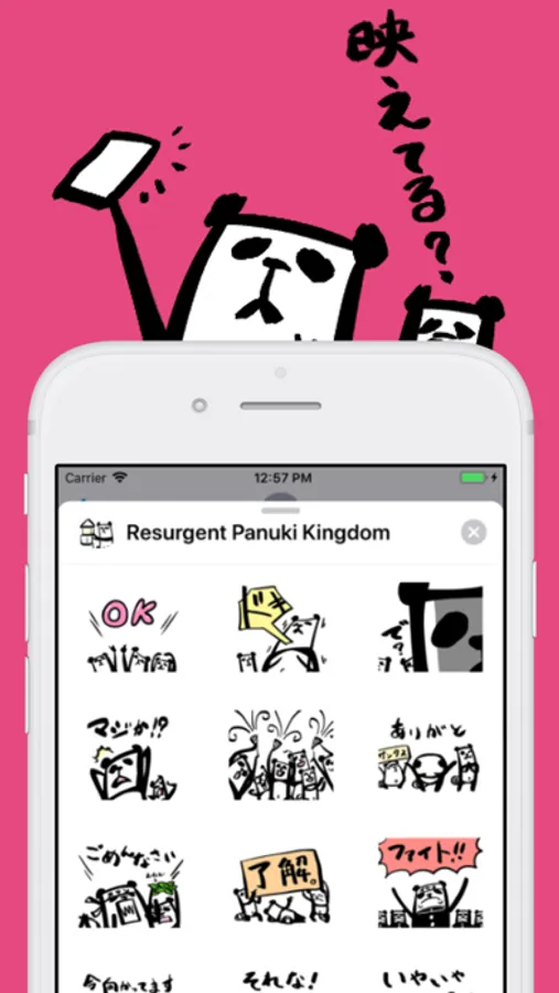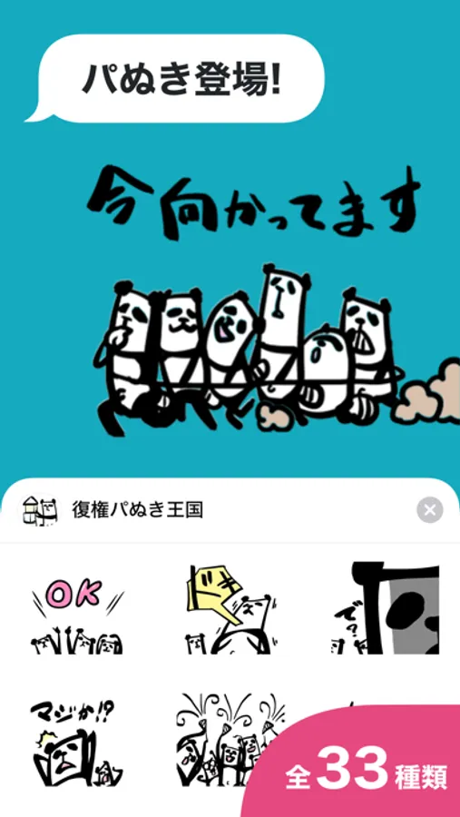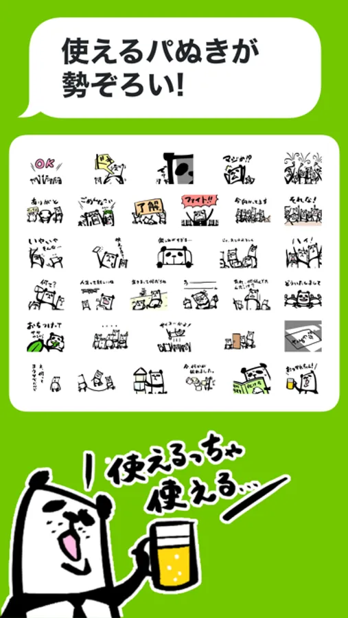 大人気のパンダに憧れ変身するも、ちょっぴり失敗!? しっぽとおへそはたぬきのままの、なんちゃってパぬき。人気者の座を奪取すべく、力なく頑張るぱぬきスタンプ