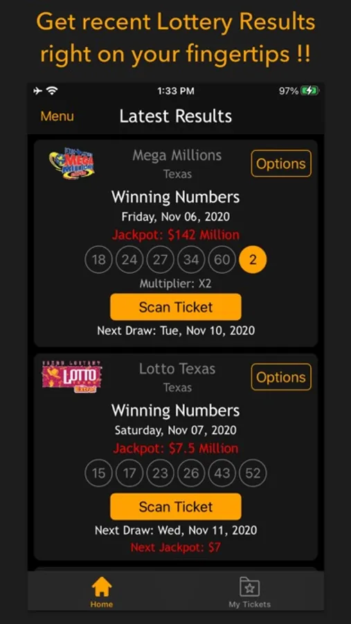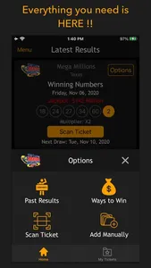 The latest jackpot winning numbers are loaded with history (Past results) for each game, prize levels/payouts (Ways to Win) and you can also scan physical ticket information for games. The scanning and detection of lottery information albeit works correctly, the user has full independence in reviewing and modifying the numbers before checking results against or storing away in phone storage.