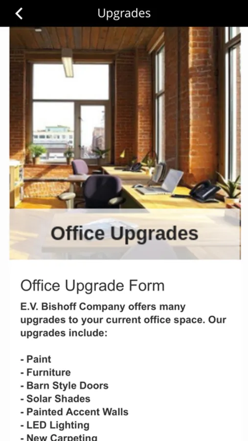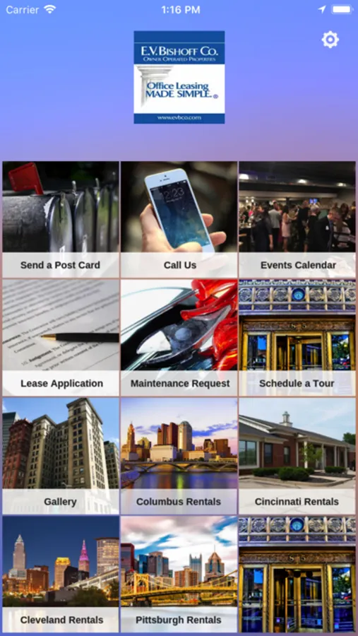 Office leasing made simple app. Pay rent, schedule conference rooms and more. You can check out our buildings and see what each of our cities have to offer. Keep up on new and notes as well as EV Bishoff Company events. In addition, you will be able to take advantage of exclusive offers.
