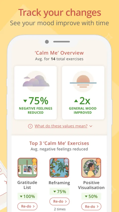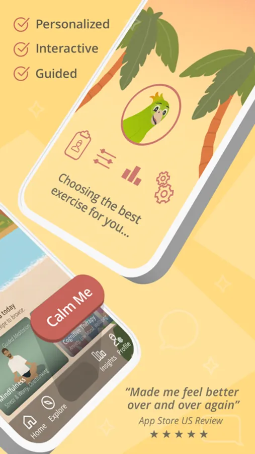 The app has a wide library of activities to support your longer-term mental health needs, including specific content for panic, anxiety, low mood, and depression. Our users love the effective Calm Me exercises for how quickly they work—in less than 10 minutes!