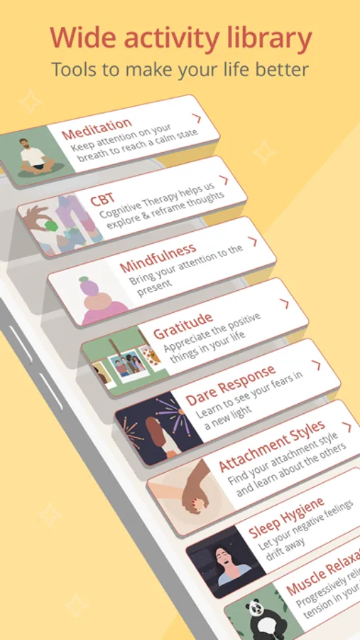 Everyone experiences panic and anxiety differently. There is no one-size-fits all solution for mental health. The app’s smart recommender gives you clear suggestions for activities specific to your profile. You’ll never feel lost or confused about what to do next!