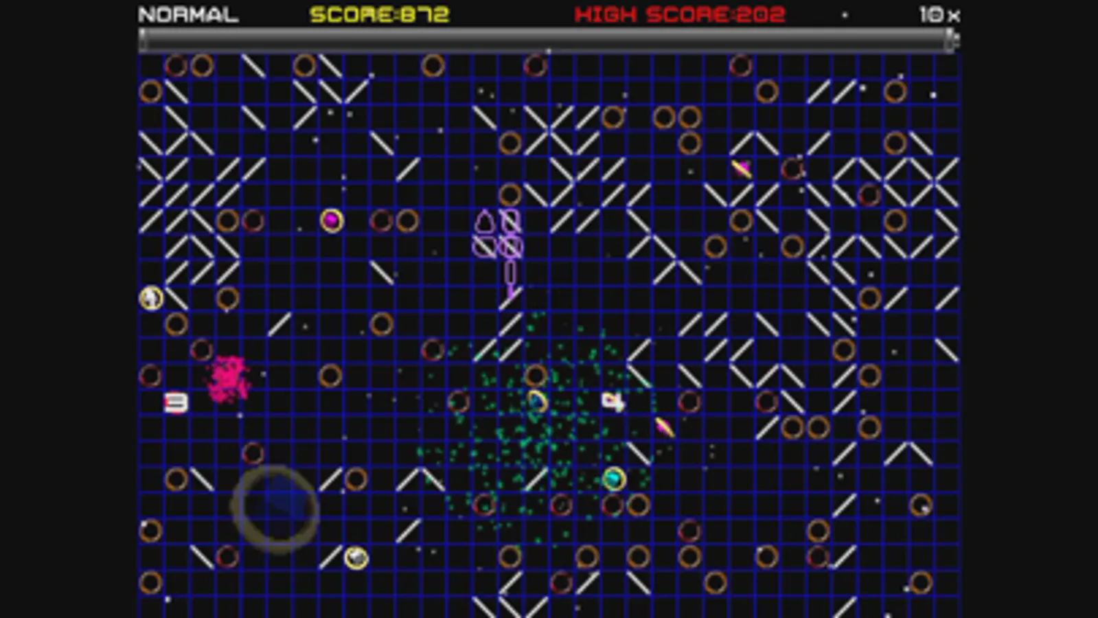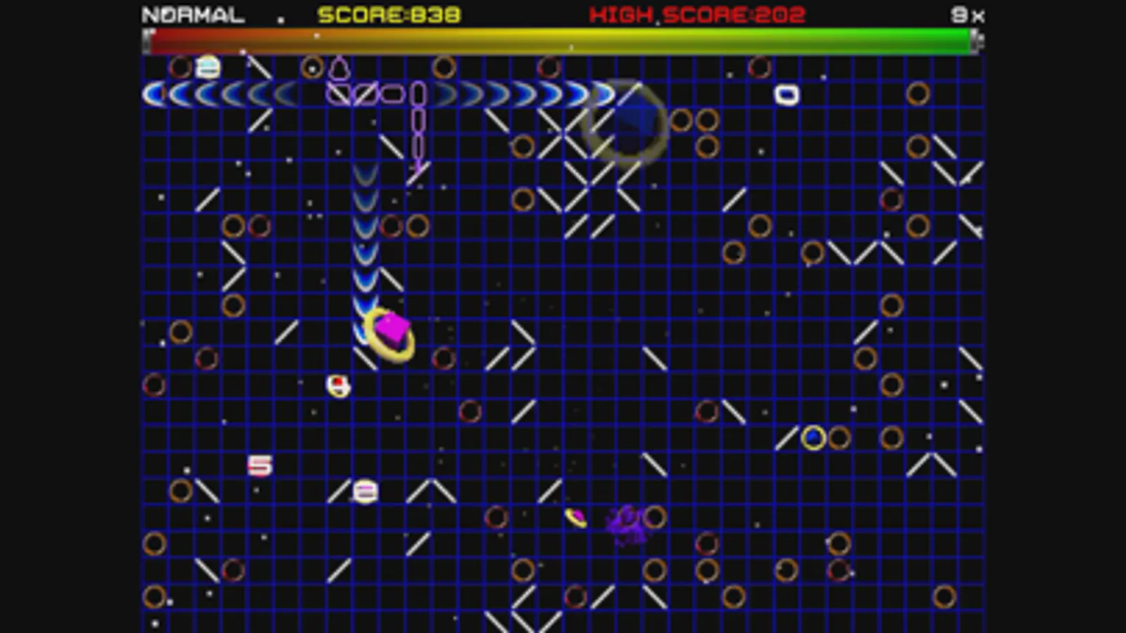Normal: Consume the dischargers to stay alive. Your power is constantly being drained by the grid and this is the only way to keep it up. Every movement will drop a deflector, which is your means to change direction, so you need to be quick with your fingers to preserve movement options.